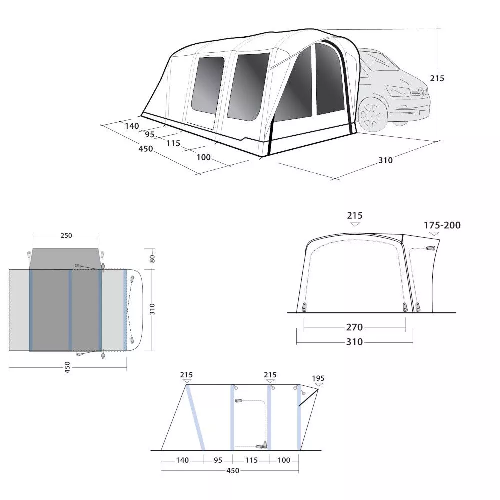 Das Outwell Wolfburg 450 Air ist ein freistehendes, aufblasbares Vorzelt, das parallel zum Bus steht. Trotz der schönen Grösse benötigt es gemeinsam mit dem Bus nur eine recht geringe Stellfläche.