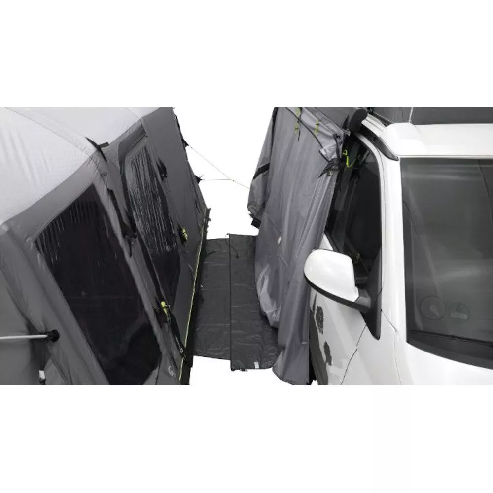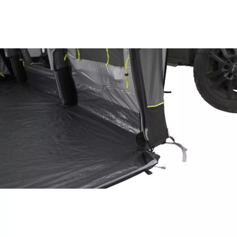 Die abnehmbare Schleuse kann an beiden Zeltseiten montiert werden. So kann die Vorderseite mit dem grossen überdachten Fronteingang entweder Richtung Fahrzeugfront oder aber zum Fahrzeugheck zeigen – ideal für Busse mit Heckküchen. Sturmbänder sorgen zusammen mit dem robusten Luftschlauchsystem auch bei widrigen Bedingungen für eine ausgezeichnete Stabilität.