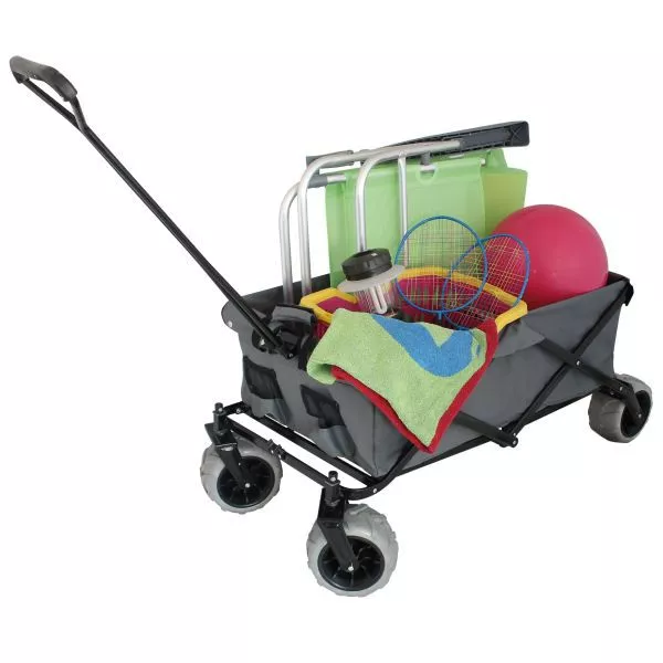 Der faltbare Gepäckwagen Eurotrail Sunny ist speziell für den Einsatz am Strand eingestellt. Die grossen Räder sorgen für einen einfachen Transport und verhindern, dass der Wagen im Sand stecken bleibt. Der Bollerwagen ist leicht zu falten und braucht wenig Platz.