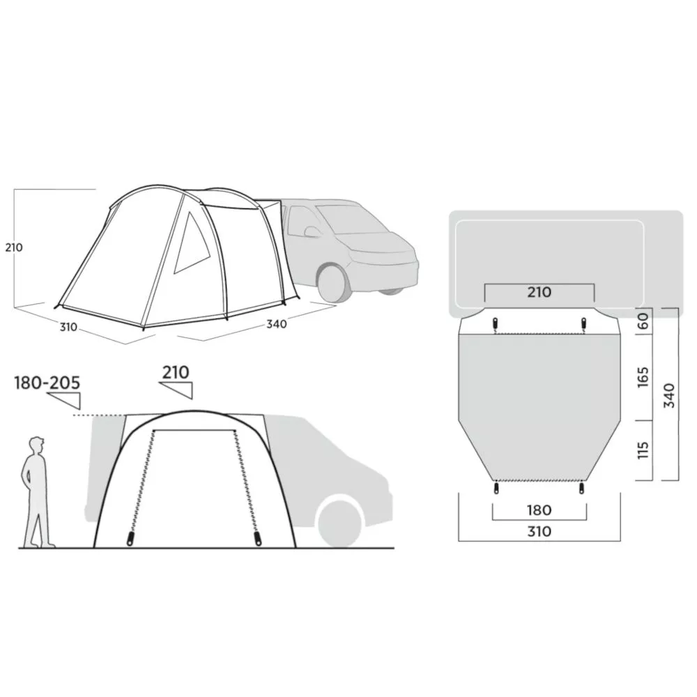 Mit einer komfortablen Stehhöhe von 210 cm lässt sich der Platz im Vorzelt optimal nutzen. Passend für Fahrzeuge mit einer Anbauhöhe von 180 bis 205 cm.