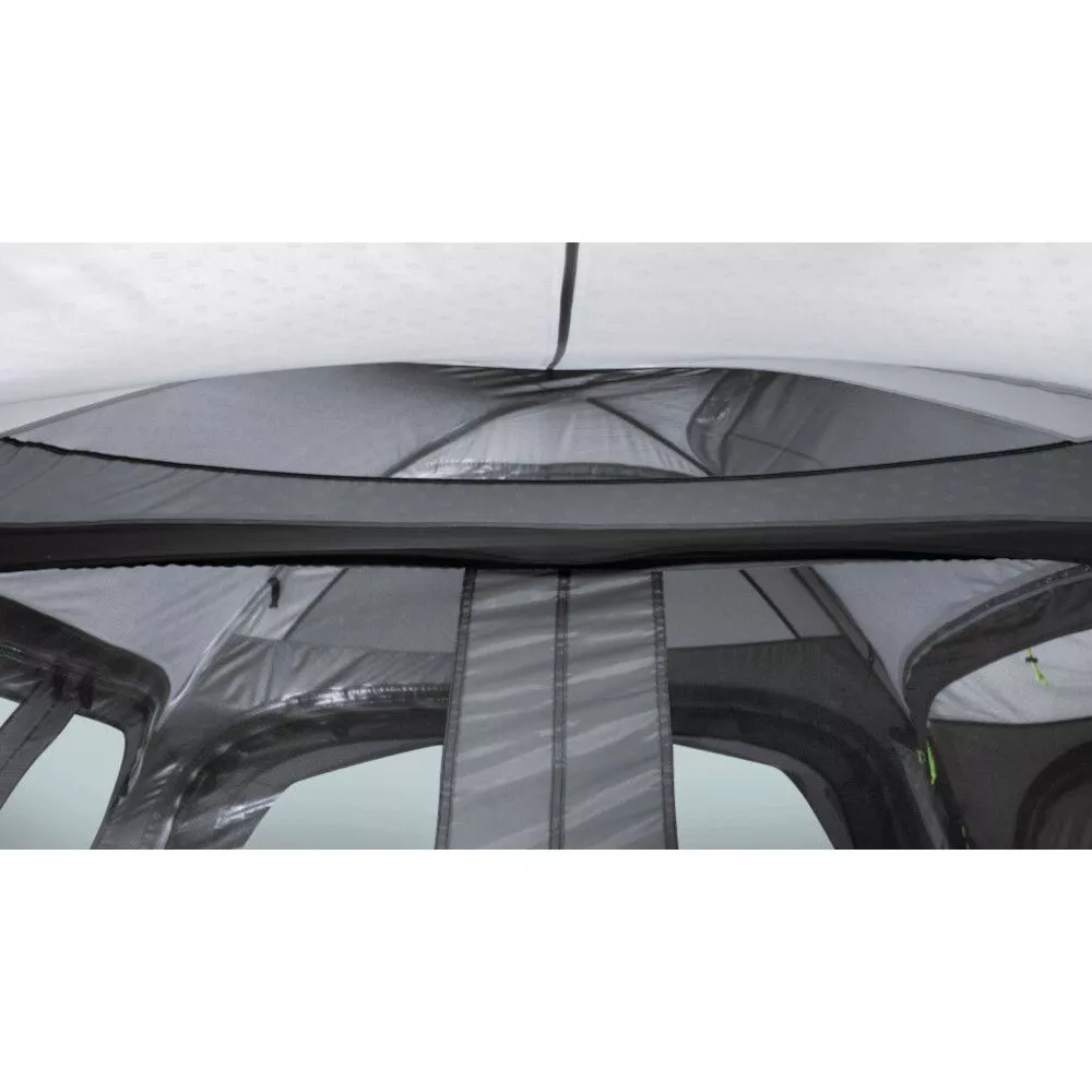 An heissen Tagen lässt sich die Frontwand vollständig öffnen. Ebenfalls lassen sich die drei vom Fahrzeug abgewandten Seiten öffnen und sind mit einem Moskitonetz versehen. Die durch Netzstoff geschützte Belüftungsöffnung an der Spitze verbessert das Klima im Vorzelt. Das grosszügige Wetter-Vordach bietet Schutz vor Regen und vor Sonneneinstrahlung.