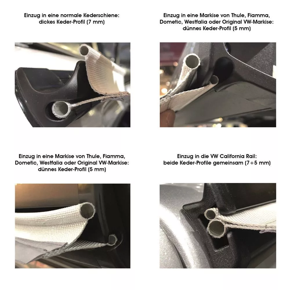zum Befestigen in Standard-Kederschiene, an einer Markise (z.B. Thule, Fiamma, Dometic, VW) oder in der VW California Rail