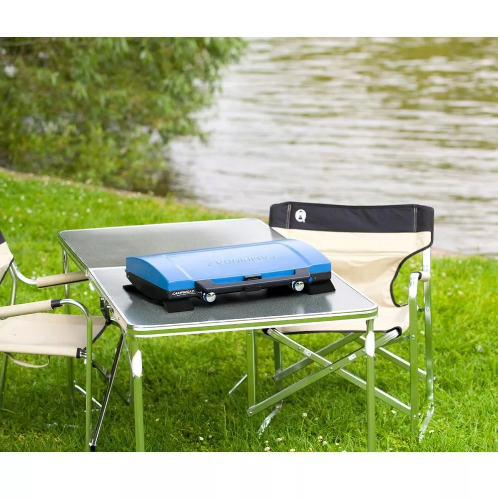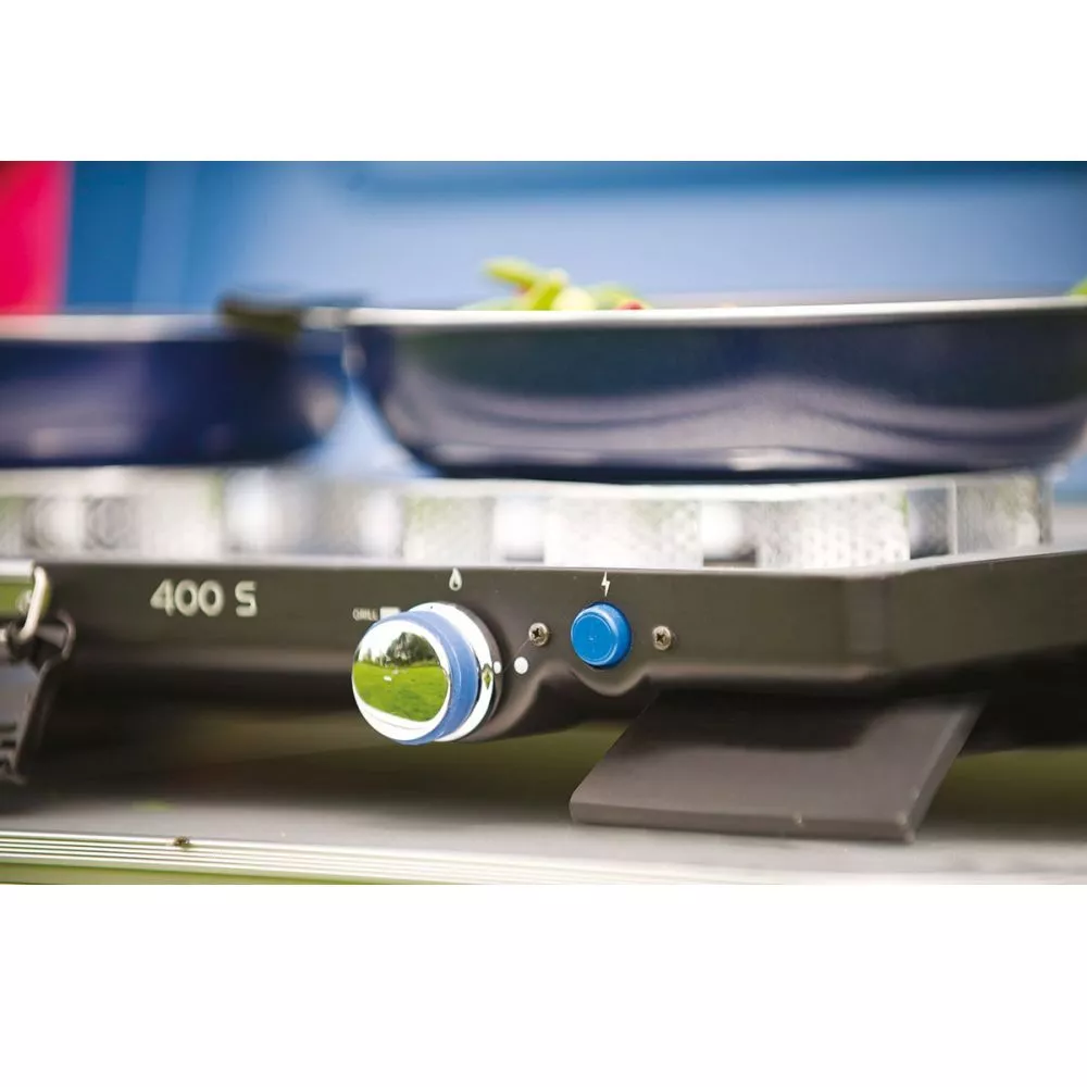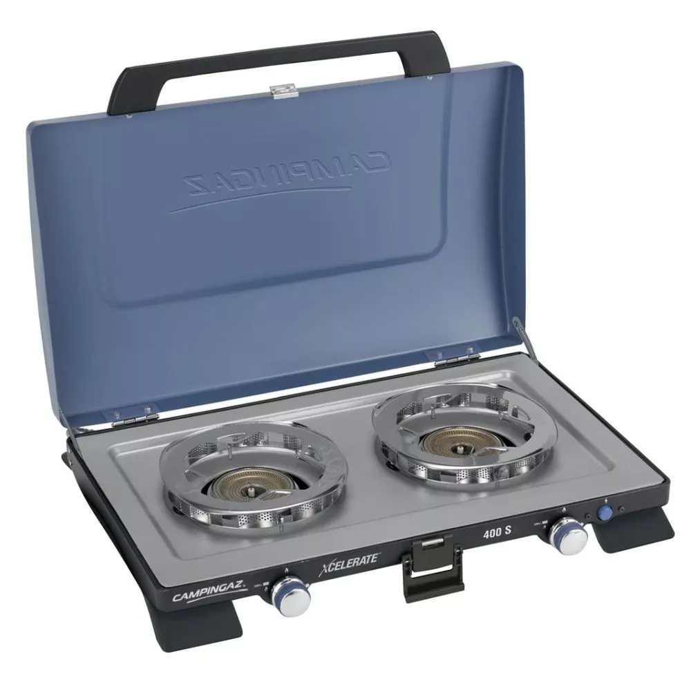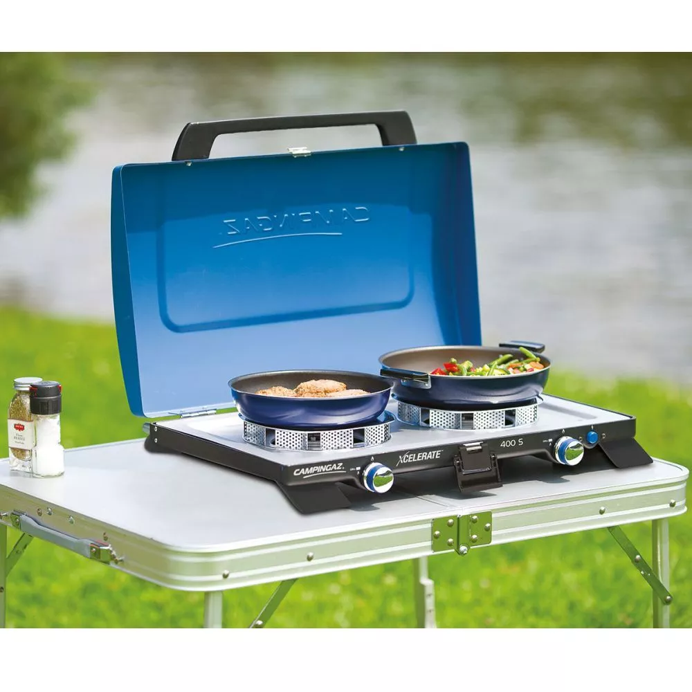 Der Campingkocher Campingaz 400 S ist ein Tischkocher mit gehobener Ausstattung. Die leistungsstarke Xcelerate Brennertechnologie stellt hohe Leistung und schnelles Kochen auch unterwegs sicher. Die Kochzeit wird bei Wind im Vergleich zu traditionellen Brennersystemen halbiert. Stabile Topfträger mit WindBlock-System erhöhen den Windschutz zusätzlich. Der hochwertiger 2-Flammkocher Campingaz 400 S ist mit robustem Deckel aus lackiertem Stahl.