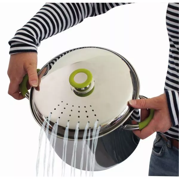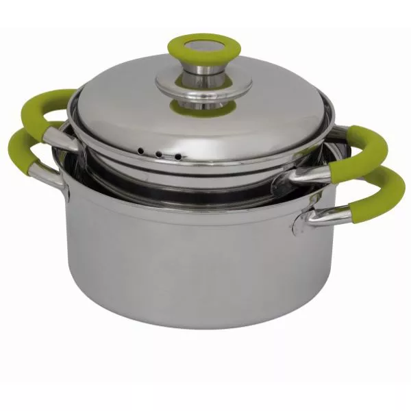 Das Camping-Kochgeschirr Eurotrail Roma ist ideal für Pasta geeignet. Damit Sie Ihr Nudelwasser abgiessen können, haben die Deckel 3 Löcher. Die Töpfe sind aus Edelstahl und haben einen hitzebeständige Silikonschutz an den Griffen. Das Edelstahl-Silber harmoniert perfekt mit dem grünen Silikon. Um platzsparend zu verstauen, lassen sich die Töpfe ineinander setzen. Das Roma Set L besteht aus drei Töpfen und Deckel.