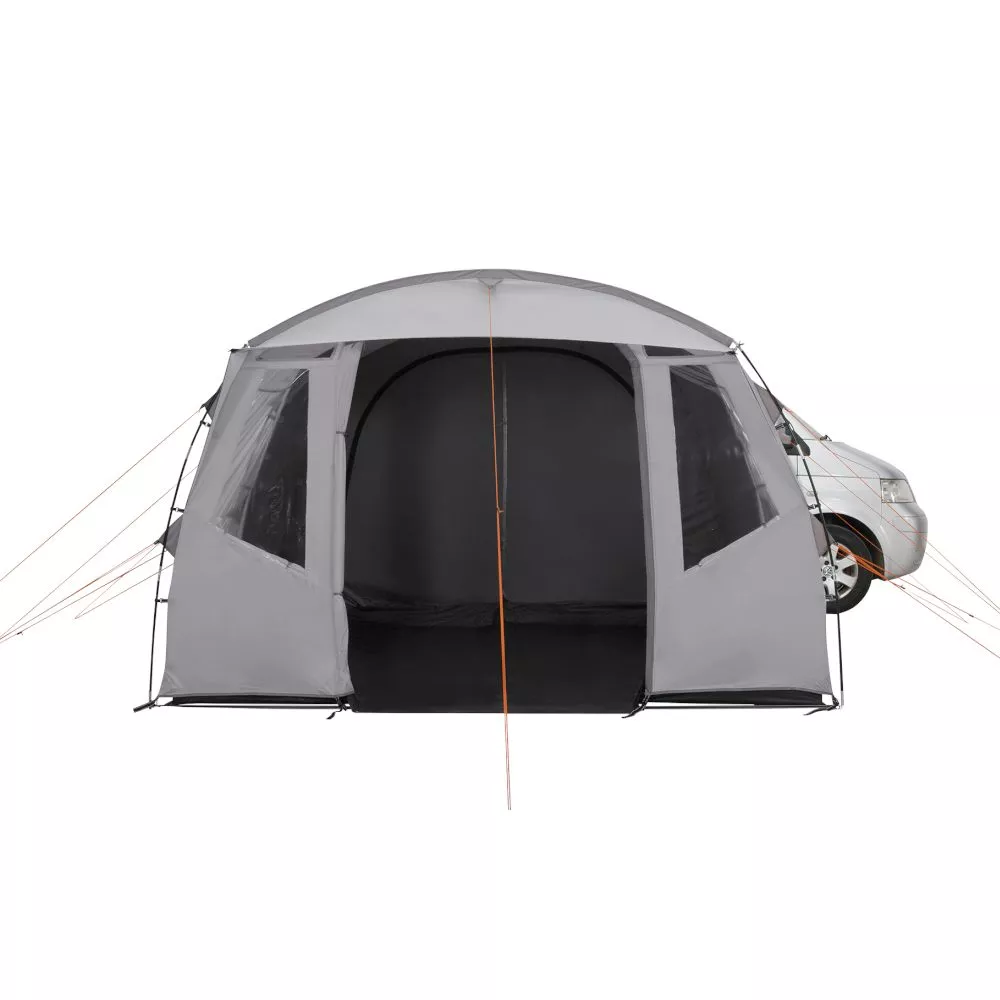 Der grosse überdachte Vordereingang und eine Doppeltüre an der Rückseite schaffen flexibles Betreten und Wechseln zwischen Zelt und Fahrzeug.