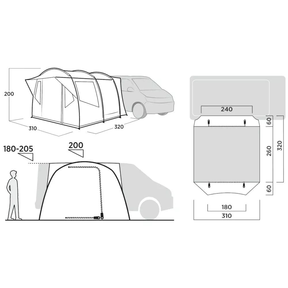Mit einer Stehhöhe von 200 cm lässt sich der Raum im Vorzelt optimal nutzen. Passend für Fahrzeuge mit einer Anbauhöhe von 180 bis 205 cm.