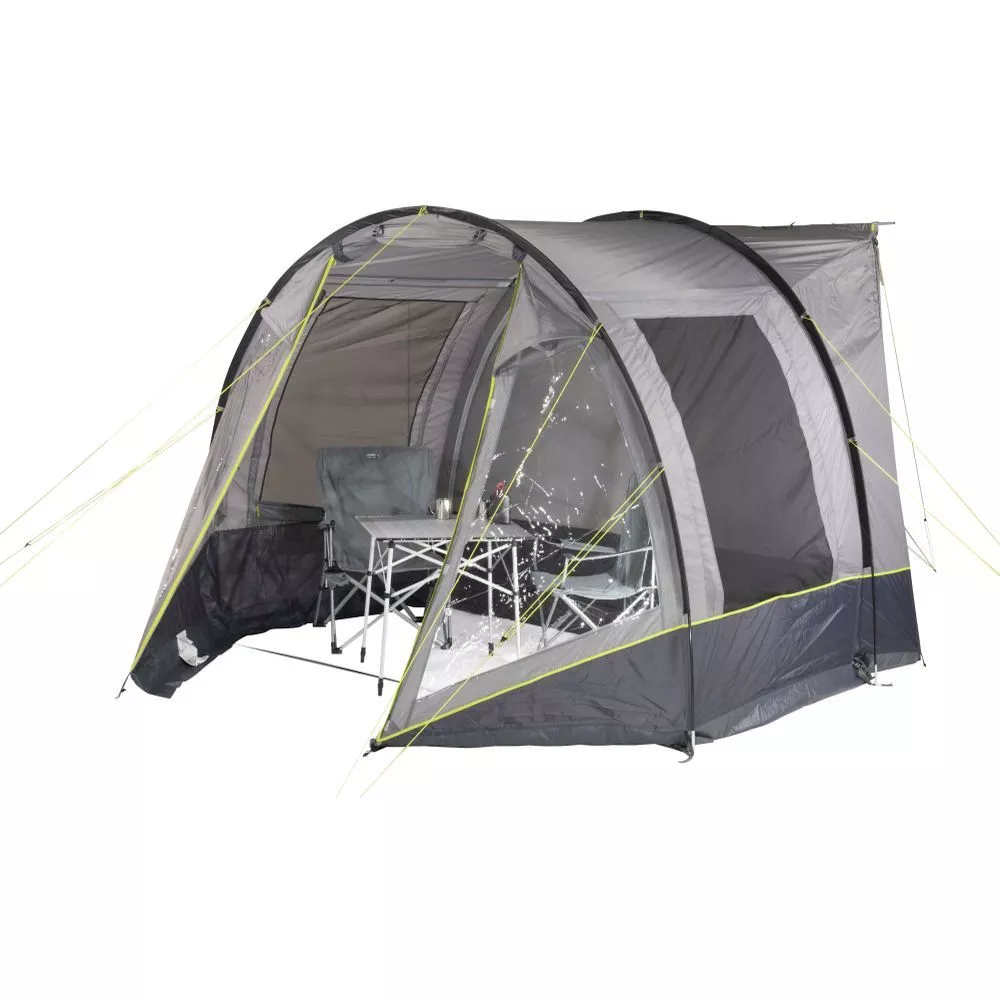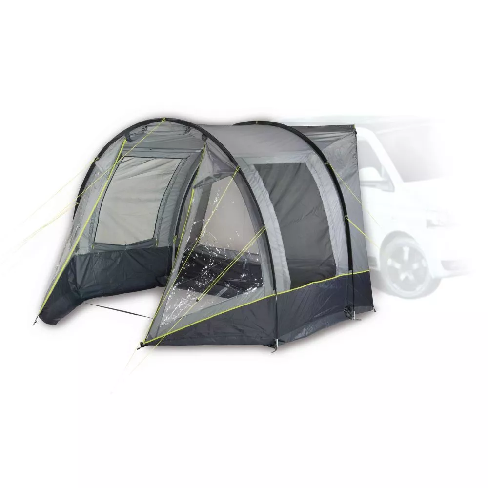 Das High Peak Avio ist ein leichts Reisevorzelt ideal für Campingbusse und Minivans mit einer Anschlusshöhe von 170 – 220 cm. DasTunnelzelt ist schnell aufgebaut und ideal für Kurztrips. Die 2 Klarsichtfolienfenster mit Gardinen und Gazefenster belüften das Zelt. Der Seiteneingang ermöglicht ein flexibles Öffnen und mehr Bewegungsfreiheit. Rundum halten Faulstreifen Nässe und Schmutz ab. Zusätzlich besitzt das Busvorzelt eine verschliessbare, teilbare Rückwand und extra starke Reissverschlüsse. Der Schleusenkanal ist mit einem Hohlsaum inklusive Schleusenstange und angenähtem Doppelkeder-Streifen 5,8 / 7,2 mm ausgestattet.