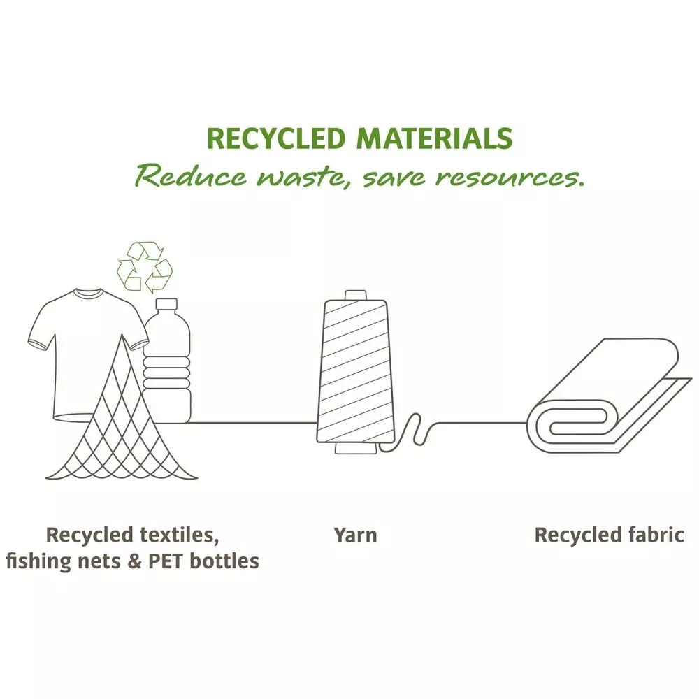 Sammeln, reinigen, granulieren und zu hochwertigem Polyestergarn verspinnen: So sieht der Recycling-Zyklus für PET-Flaschen aus. Beim Herstellunsprozess werden damit bis zu 50% Energie und rund 50% an CO2-Emissionen eingespart und es wird komplett auf die Verwendung neuer fossilier Rohstoffe aus Erdöl verzichtet. Das schont Ressourcen und hält den ökologischen Fussabdruck klein.