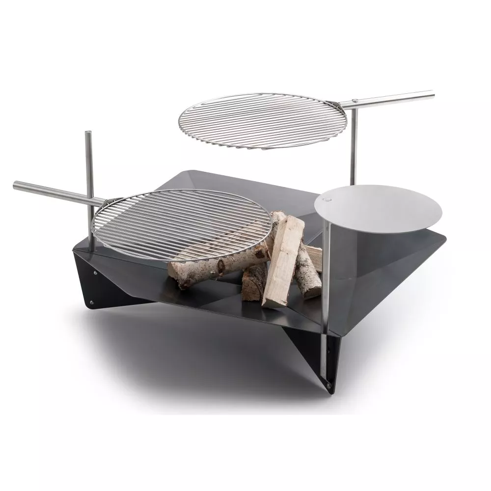 Der adaptierbare Höfats Triple 45 Grillrost ist stufenlos höhenverstell- und schwenkbar. Eine senkrechte Stange bildet die Führung, entlang derer der Grillrost um 45 cm vertikal höhenverstellt werden kann. Der Grillrost hält sich durch Verkanten selbst.