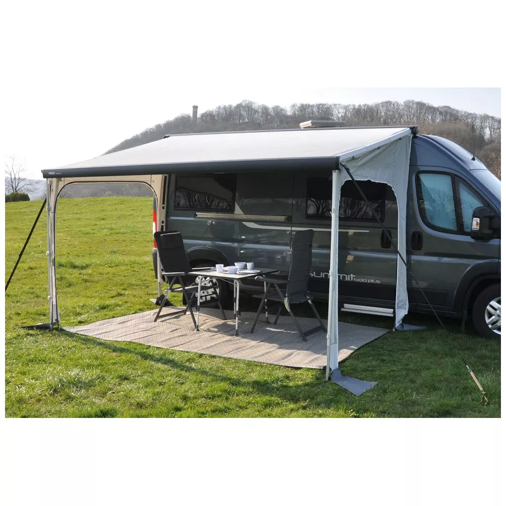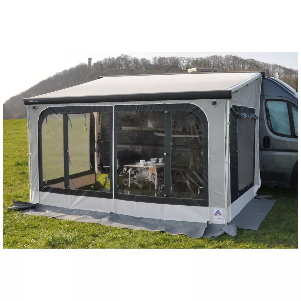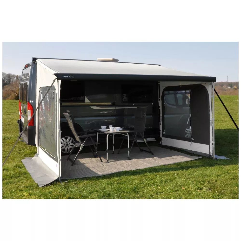 Mit dem Hahn Korsika 2.0 Markisenvorzelt verwandelst du deine Thule Omnistor Markise in einen geschlossenen Bereich vor deinem Fahrzeug. Das Korsika 2.0 ist zur Montage an allen Thule Omnistor 6200 und 6300 Markisen mit einem Auszug von 2,5 Metern und einer Breite von 3,5 Metern geeignet. Die Seitenwände werden dabei für eine sichere Verbindung zum Markisentuch mittels im Lieferumfang enthaltener Klemmprofile befestigt. Die Vorderwandelemente ziehst du einfach in die Kederschiene deiner Markise ein.
