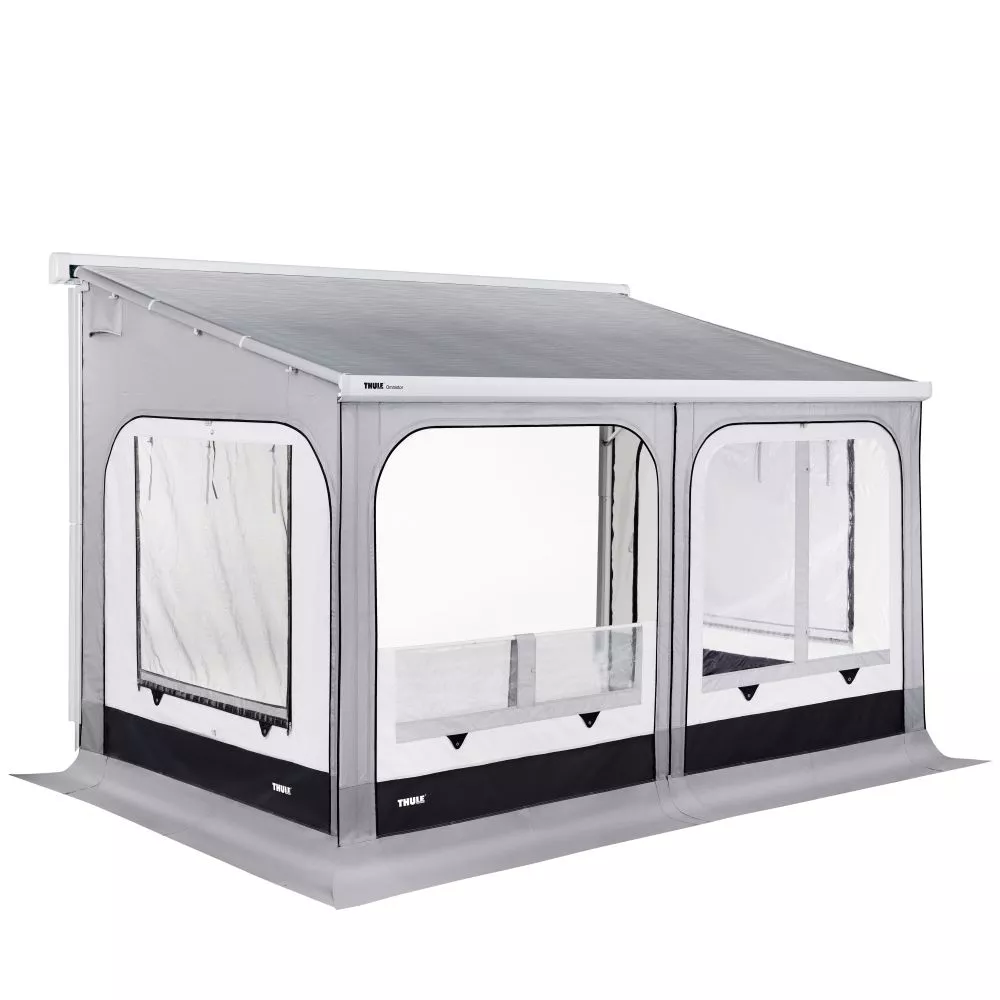 Das Markisenzelt Thule Panorama für die Thule Omnistor 8000 Markise besteht wie das bewährte Safari Residence aus einer Vorderwand und zwei Seitenteilen. Es bietet die gleiche hervorragende Stabilität und ist genauso leicht aufzubauen. Die Vorderwand wird einfach in die Frontleiste der Markise eingeschoben und mit den Seitenwänden, die durch ein Klemmprofil am Markisentuch befestigt werden, mittels Reissverschluss verbunden. Durch die grossen Panoramafenster ist für mehr Lichteinfall und besseren Blick nach draussen gesorgt. Die Frontfenster können vertikal geöffnet, als Tür, oder horizontal geöffnet, zum Lüften, genutzt werden. Alle Teile sind vollständig abnehmbar. Für ausreichende Belüftung ist dank der beiden in den Seitenwänden integrierten Belüftungsstreifen auch bei geschlossenem Zelt gesorgt. Beide Seitenfenster sind zudem mit Moskitonetzen ausgestattet. Das Markisenzelt Thule Safari Panorama ist aus Airtex gefertigt, einseitig mit Acrylat beschichtet und mit einem teflonbasierten Finish imprägniert. Durch die Fungizidbehandlung wird das wasserabweisende, waschbare Material wirksam vor Pilz- und Schimmelbefall geschützt. Lieferbar in zwei Höhen, Höhe medium wird bei einer Montagehöhe von 2,3 – 2,44 m (gemessen von der Unterkante der Markisen-Kassette bis zum Boden), Höhe large bei einer Montagehöhe von 2,45 – 2,59 m und Höhe extra-large bei 2,6 – 2,74 m benötigt. Lieferung erfolgt inklusive Packtaschen und Wagenschürze.