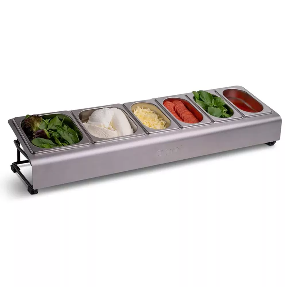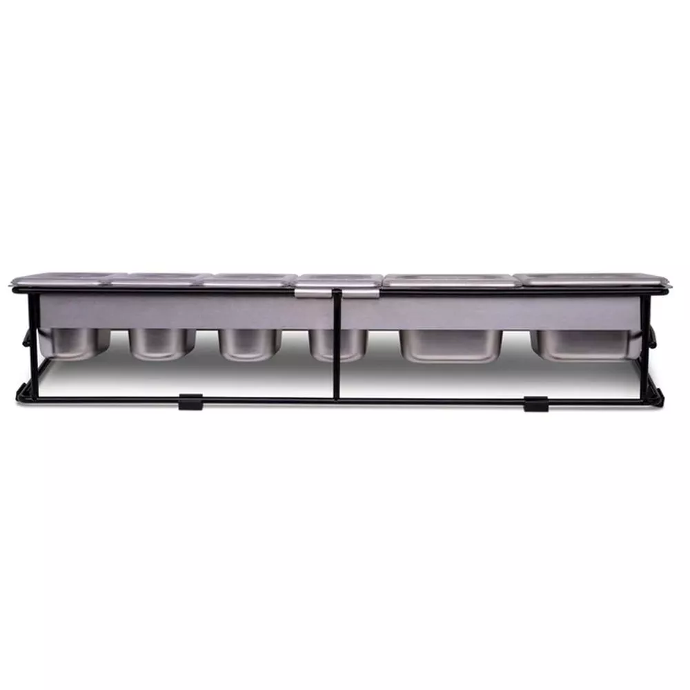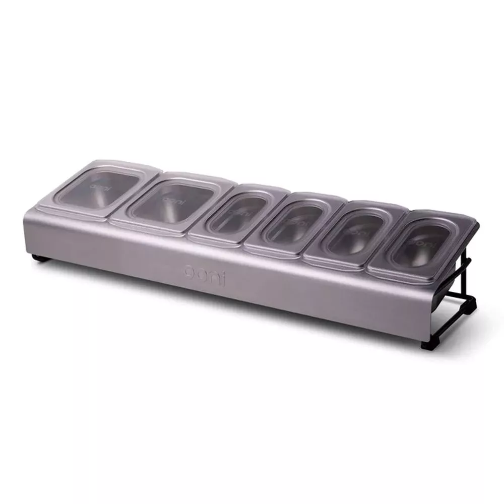Mit der Ooni Pizzabelag-Station kannst du dich stilvoll auf die nächste Pizza-Party vorbereiten. Es ist das perfekte Zubehör zum Vorbereiten von Zutaten und Belägen. Dank des leicht zu transportierenden Systems wird der Umzug von der Innen- in die Aussenküche zum Kinderspiel. Mit den beiden Ooni Pizzabelag-Behältern mit einem Fassungsvermögen von 1,6 l und den vier Behältern mit einem Fassungsvermögen von 0,8 l kannst du problemlos dafür sorgen, dass du ausreichend Belag für alle deine Pizzen parat hast. Durch einen speziell angefertigten passenden Deckel lassen sich alle Behälter mühelos stapeln und im Kühlschrank verstauen. Die Edelstahl-Abdeckung und der witterungsbeständige, pulverbeschichtete Rahmen passen perfekt auf die Küchentische von Ooni und ermöglichen eine einfache Reinigung sowie einen unkomplizierten Transport. Optimiere deine Pizzazubereitung im Freien mit einer perfekt ausgestatteten Küche, in der die Ooni Pizzabelag-Station nicht fehlen darf.