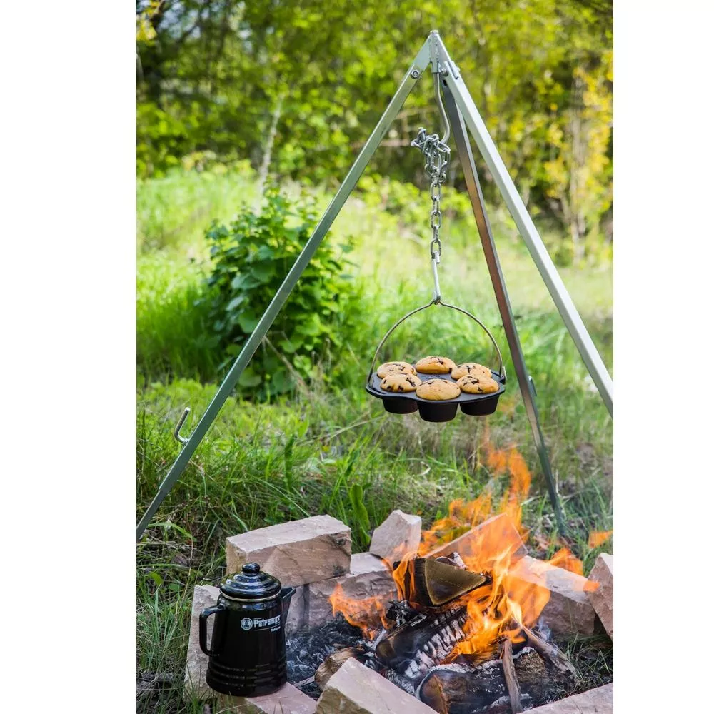 Zum einfachen Handling besitzt die Muffinform einen Bügel aus Edelstahl. An diesem kannst du die Gusseisen-Backform auch an einem Dreibein über dem Lagerfeuer aufhängen und dort deine Muffins backen.