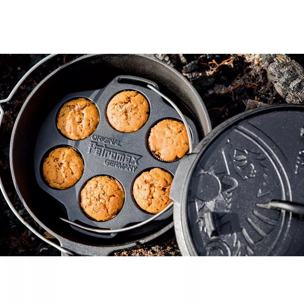 Die Petromax Muffinform aus Gusseisen passt sich nahtlos in die Petromax Produktpalette ein und erweitert diese sinnvoll. Die Backform bietet dir Platz für insgesamt sechs leckere kleine Küchlein. Dank dem praktischen Henkel mit Einkerbung kannst du die Form direkt auf deinem Grill, über dem Lagerfeuer, in einem Glutnest, im Backofen und sogar in den Feuertöpfen ft6 und ft9 perfekte Muffins backen. Beachten Sie bitte, dass bei der Verwendung der Muffinform im ft9 noch ein zusätzlicher Stapelrost oder der gusseiserne Untersetzer benötigt wird, damit die Form nicht im Topf verkantet und so das Material beschädigt.