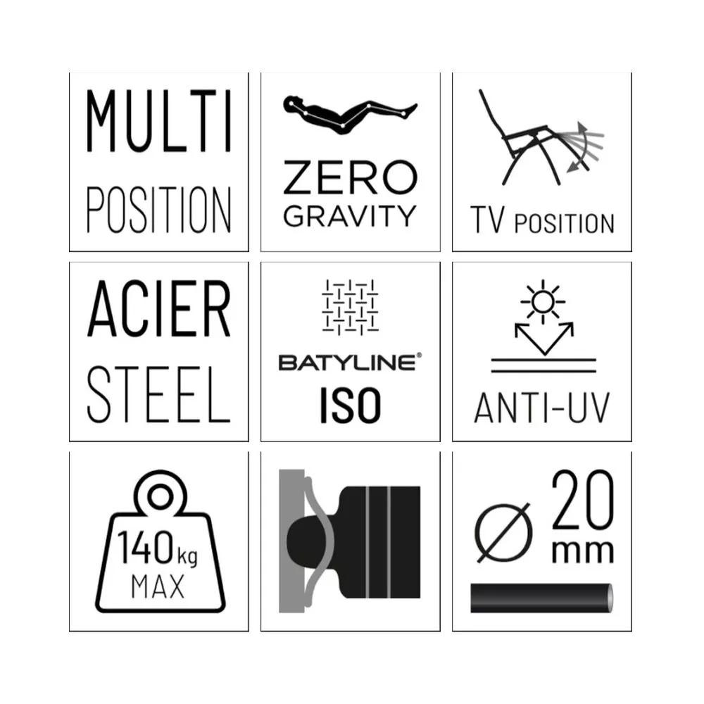 Der abnehmbare, für den Aussenbereich entwickelte Batyline-Bezug wird durch Clips aus Elastomer an dem äusserst belastbaren Stahlrohrrahmen des Liegestuhls gehalten.