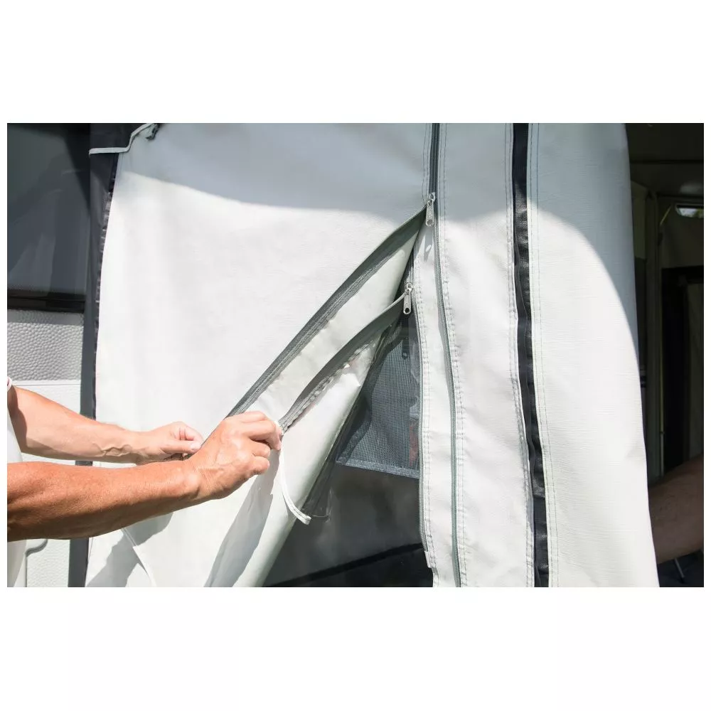 Das dwt Vorzelt mit robustem Stahlgestänge lässt sich an allen Wohnwagen mit einer Kederschienenhöhe von 240 – 258 cm problemlos einziehen. Dank dem PVC-beschichteten Polyestergewebe und der variablen Wandgestaltung bist du bestens für sämtliche Wetterlagen gerüstet.