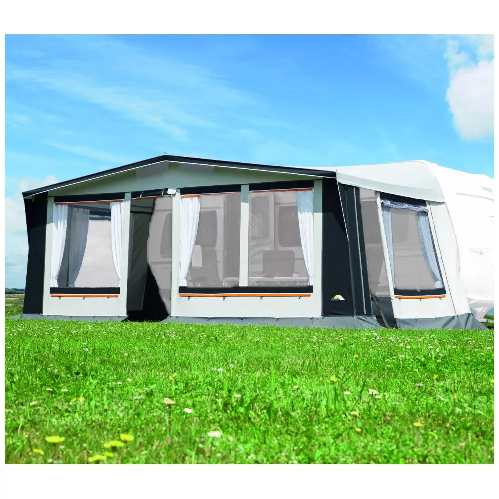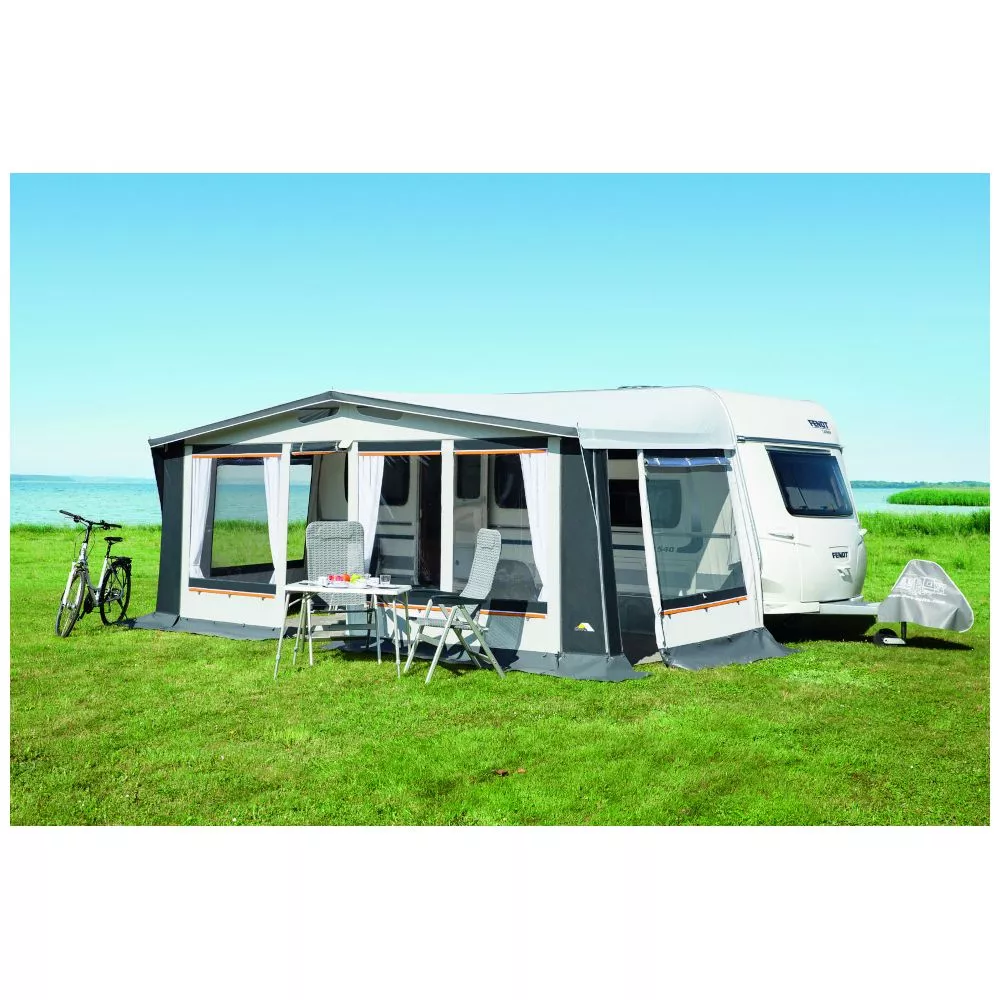 Das Vorzelt dwt Prinz Plus ist für alle Jahreszeiten die richtige Entscheidung. Die attraktive Farbkombination dieses modernen Vorzeltes liegt voll im Trend. Die verarbeiteten Materialen trotzen jedem Wetter, lassen sich leicht reinigen und sind besonders robust. Die innen eingenähten Hohlsäume in den Wänden nehmen Zusatzstangen für mehr Stabilität auf. Die Vorderwand-Segmente lassen sich zu einer Veranda abklappen. Für mehr Platz kannst du beim dwt Prinz Plus auf der rechten Seite einen Erker anbauen.