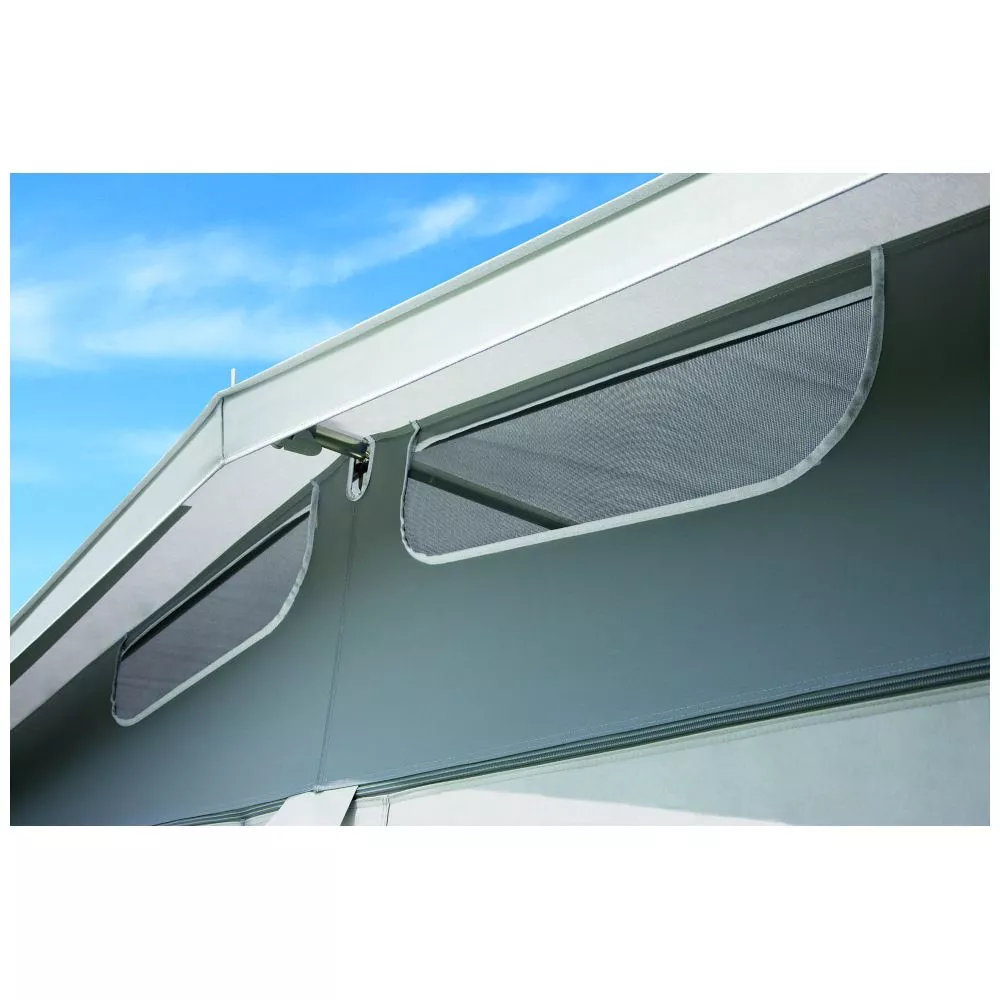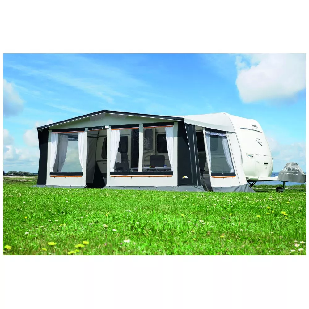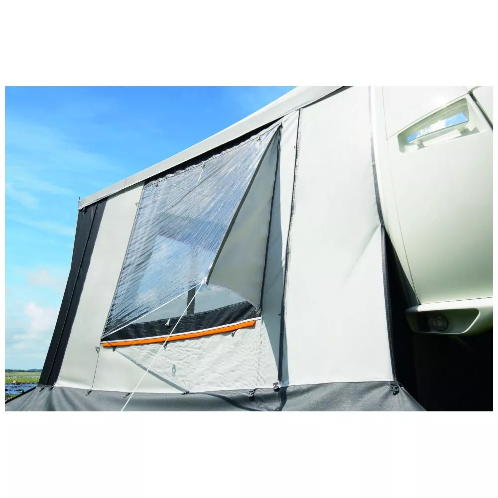 ist ein Ausgleichselement um die leicht schräg gestellte Vorzelt-Seitenwand an einen aerodynamischen Bugverlauf am Fahrzeug ausgleichen zu können. Sie steigert die Passform des Zeltes. Damit behält die rechte Seitenwand des Zeltes ihre konstruktiv vorgegebene Neigung, die für einen Erkeranbau notwendig ist. Die doppelte Windecke und die Seitenwand verfügen über einen separaten Einzugskeder, so dass wahlweise beim Zeltaufbau entschieden werden kann. - Robuste Reissverschlüsse: